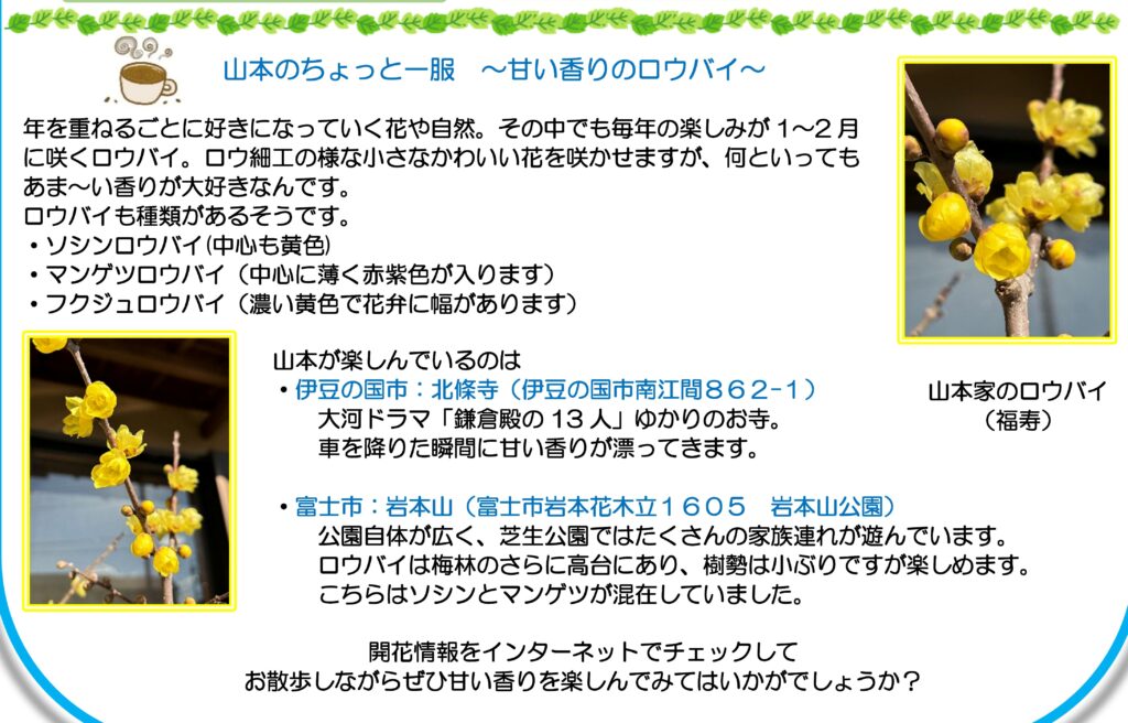 サンハウス通信最新号にも掲載しましたが、ロウバイ大好きな山本。